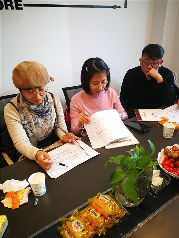 本次活动分为理论回顾和现场实践两部分。理论回顾环节,由王明老师带领大家从风水的起源、发展,到风水在现实生活中的应用逐步进行了回顾。应用八宅风水、金锁玉关风水知识针对将要实践的户型图进行讲解,教大家如何定向、如何使用立极尺以及通过屋宅主人的出生年,确定主人命卦,在遵循东四命住东四宅,西四命住西四宅的原则再结合四吉方、四凶方来布局。王明老讲解言简意赅、幽默风趣,让老学员温故知新的同时又让新参加的设计师也能充分理解风水各项知识含义及在现实设计中应用,现场的研讨氛围十分活跃。