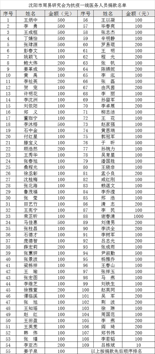 2020冬春交替之际,一场疫情突袭中华大地,“新型冠状病毒”这个词语,让人胆战心惊。医务人员勇敢的奔赴前线,用生命为后方撑起一片安全的蓝天。此时,18新利首页的会员们及国学爱好者并没有忘记自己的使命,没有忘记自己是中华优秀传统文化的传承者。 复工伊始,18新利首页发起了《爱的倡议》,倡议会员、学员、国学爱好者向一线医生捐款。捐款倡议得到了会员和易学爱好者的热烈响应,捐款通知一经发出,大家就马上踊跃参与。其中一些会员都在其它机构进行了不同数额的捐赠,还在响应我会的号召,进一步体现中华优秀传统文化的情怀。短短几天时间内,参与捐款的人数就达到了109人,捐款共计17610元。