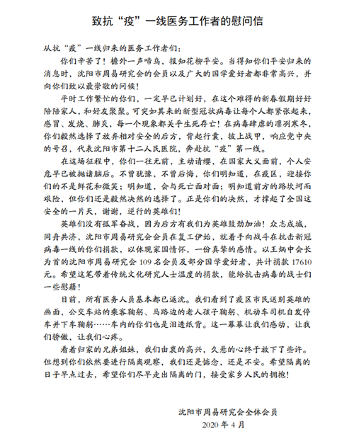 赠送锦旗后,我会会员代表董珈宁宣读了我会写给驰援人员的一封慰问信。随后,王炳中会长向驰援人员家属代表进行捐赠,捐赠的款项将用于资助辽沈地区支援湖北一线疫情防治人员生活补助。