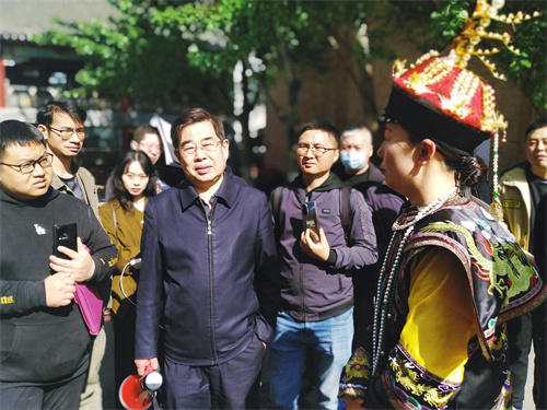 开课前全体学员在三圣殿前进行易学课前礼,共同祭拜易学三圣,王炳中会长代表全体学员向三圣敬香。
